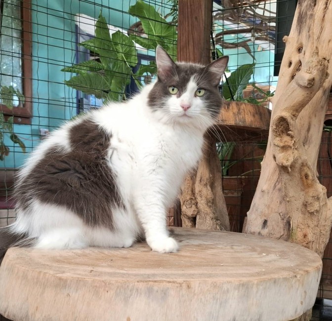 Miepie (9, grijs/wit, fluffy): een zachte, lieve poes die graag bij je is en ook het binnenleven waardeert.